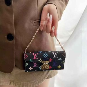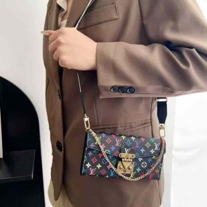 上品見えするトランクのロックスタイルの留め具をあしらい、カラフルなモノグラム柄はお洒落で高級感があります。